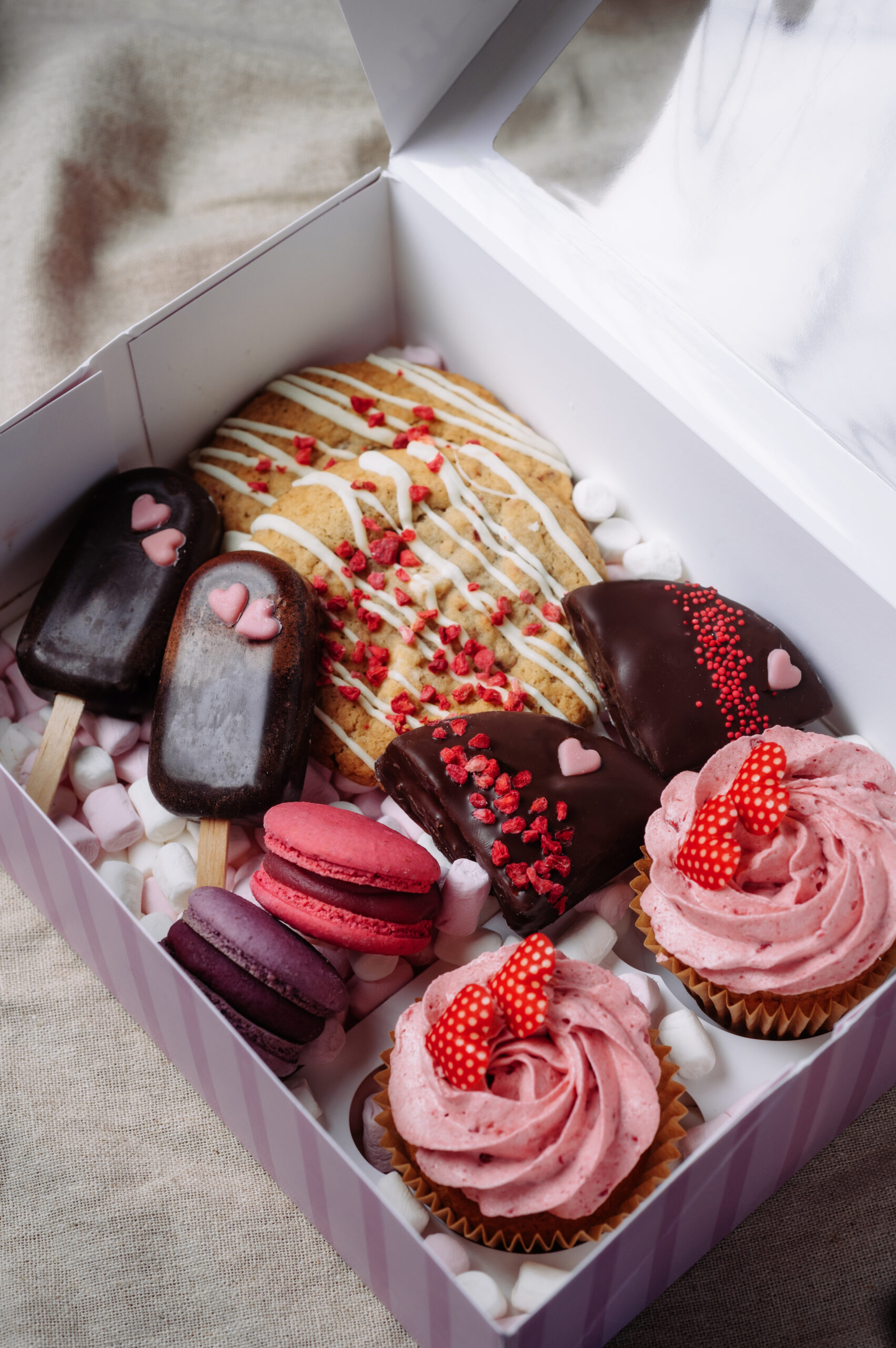 Innholdet er glutenfritt, lavkarbo. Cookies inneholder melk og hasselnøtter. Makroner inneholder mandler. Cupcakes inneholder melk, egg og mandler. Cakepops inneholder egg og mandler.